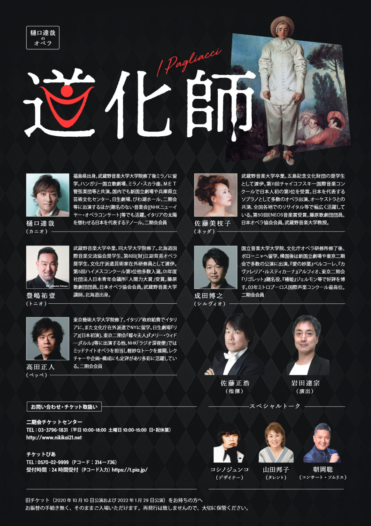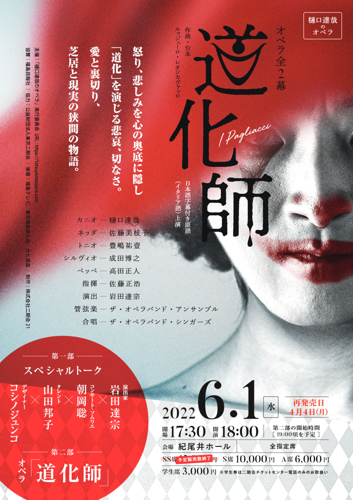 | 2020年6月17日 | オペラ《道化師》は1年から1年半を目途に延期を検討中です。新たな日時・会場が決まり次第、発表予定です。既にチケットをご購入されたお客様におかれましては、追ってご連絡しますので、しばらくお待ちいただければ幸いです。 |